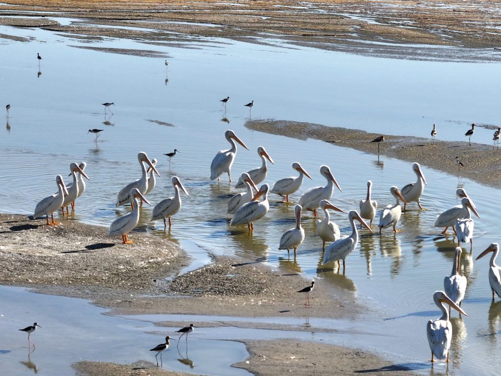 Pelícanos blancos americanos, cigüeñuelas de cuello negro y avocetas americanas en el extremo sur del Salton Sea.
