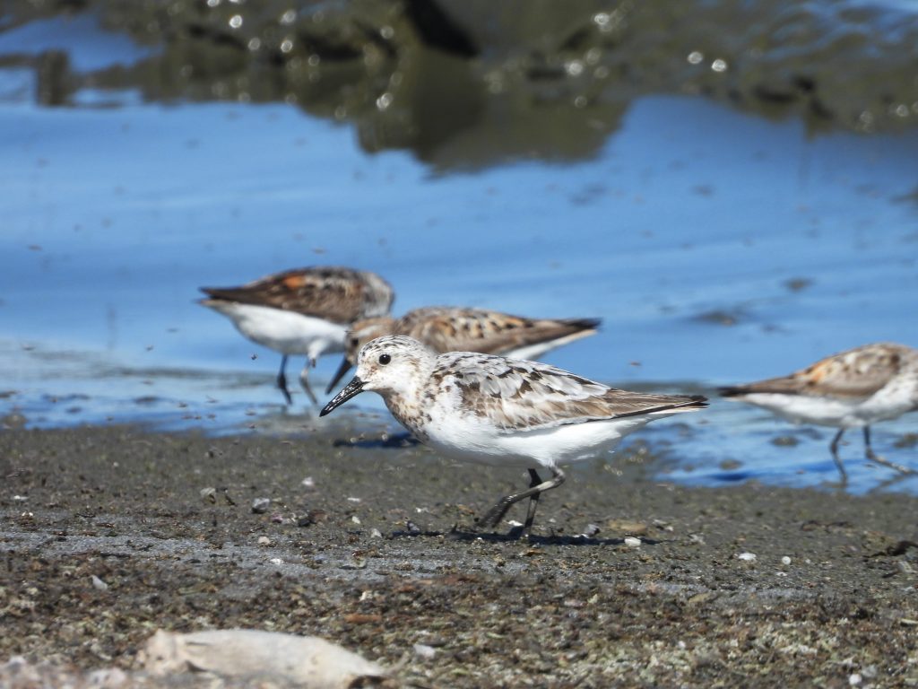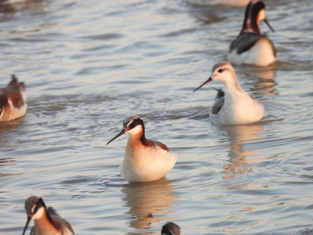 Cormoranes neotropicales, una cigüeñuela común y un pato colorado al fondo, junto a la pila de troncos.Falaropos de Wilson en el estanque East Pond, recientemente llenado.Un correlimos tridáctilo y tres correlimos occidentales detrás de él.